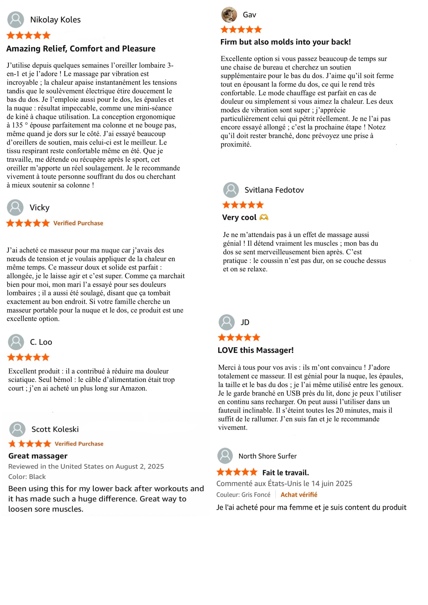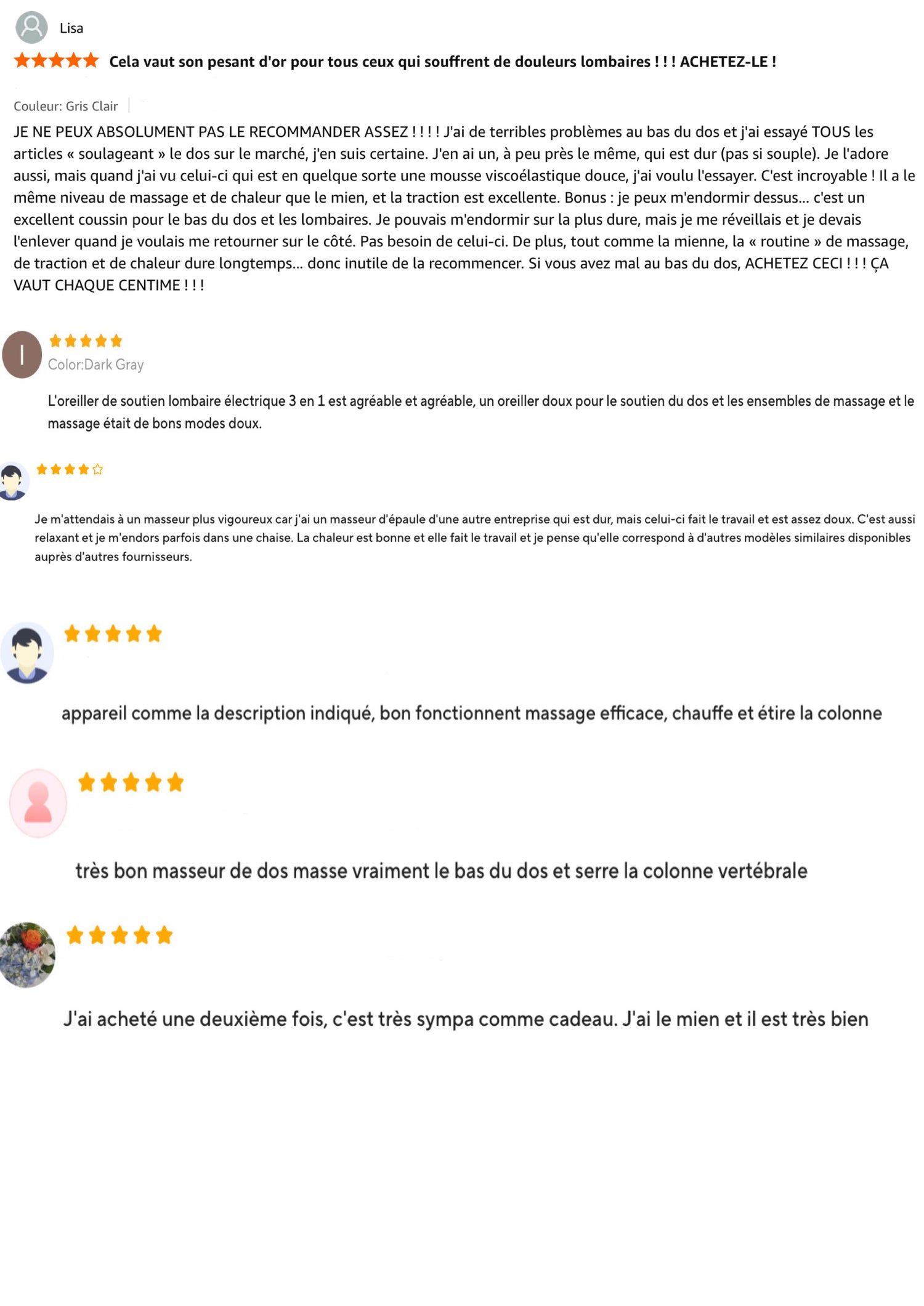 Sootheflex combine trois technologies : traction vertébrale, chaleur constante et vibration relaxante. Les coussins ou ceintures n’offrent généralement qu’une seule de ces actions.