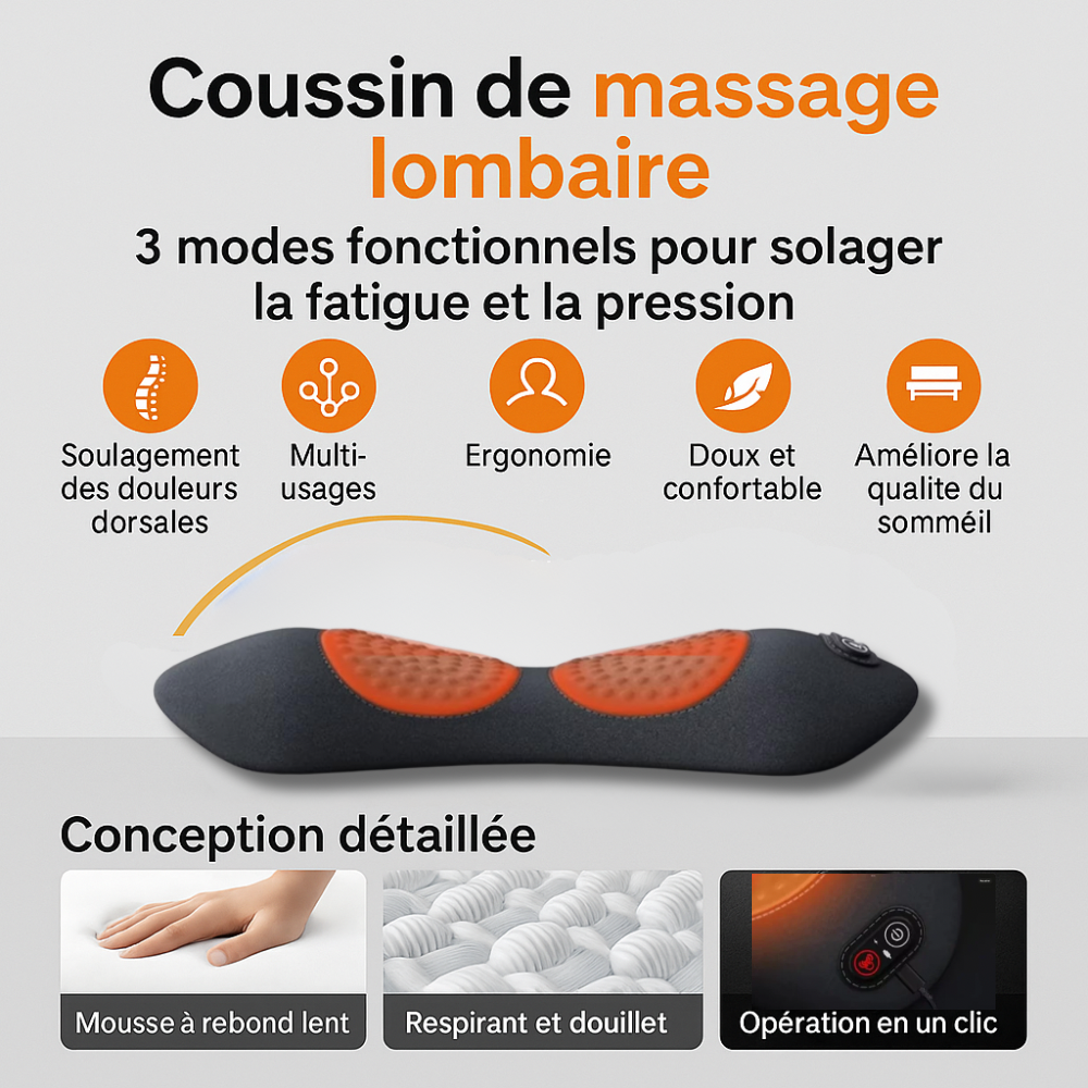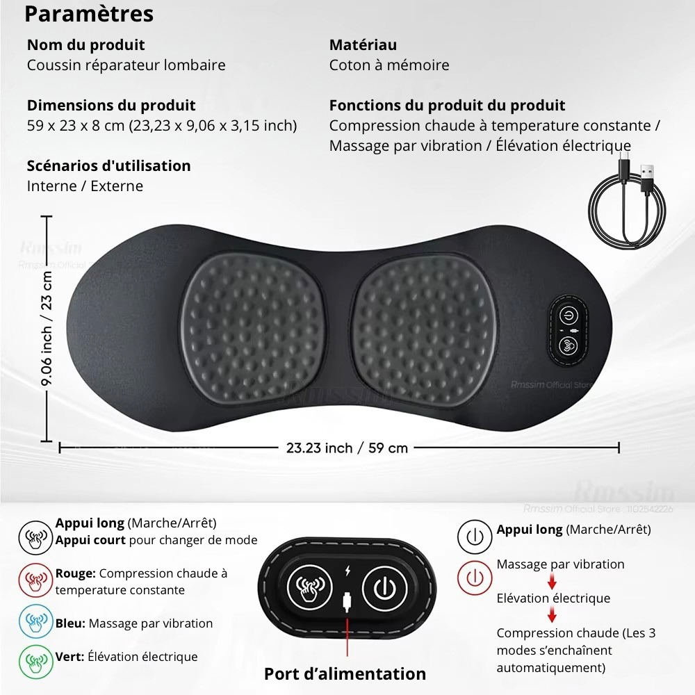 – Son support incurvé crée un léger espace entre les vertèbres, soulage immédiatement les racines nerveuses et guide la colonne vers sa courbure physiologique.